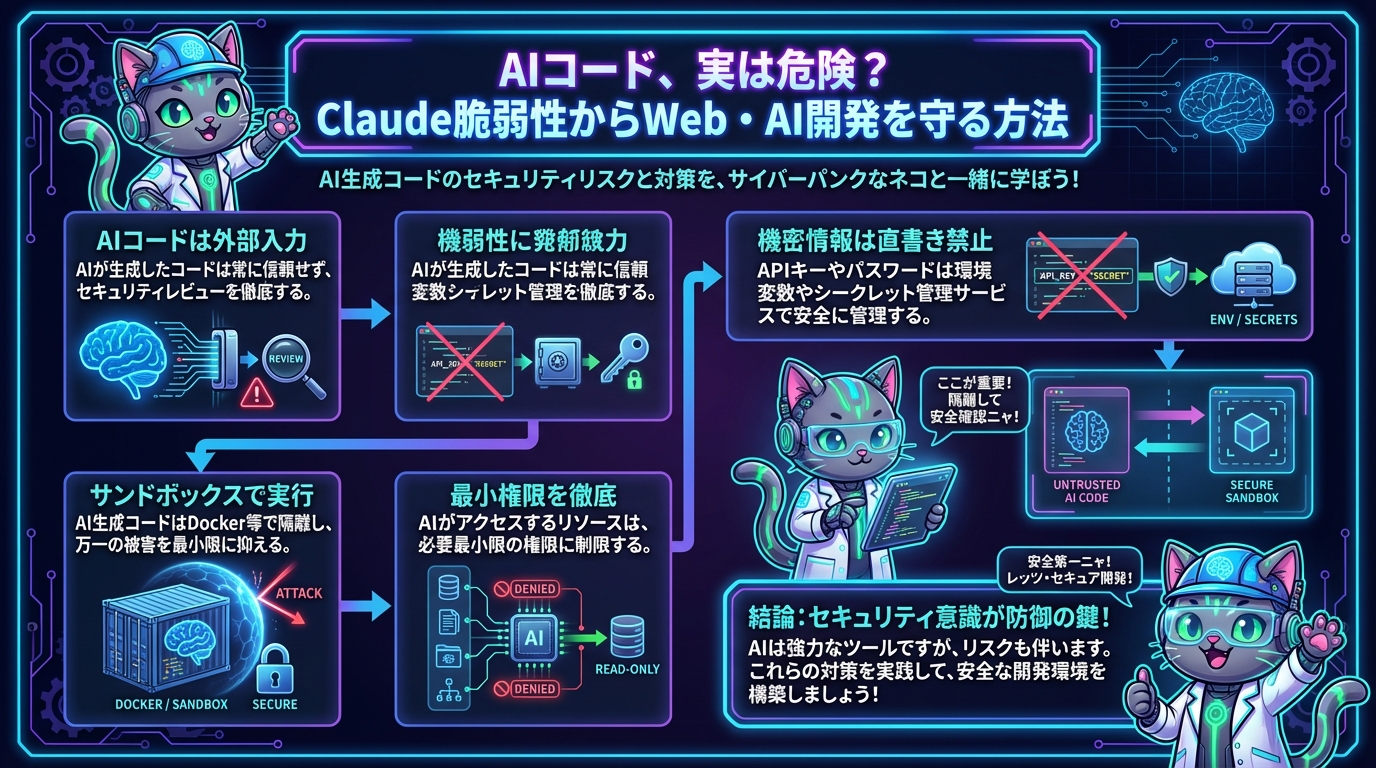 これらはすべて、今回のClaude Codeの脆弱性で問題となったRCEやAPIキー窃取に繋がりかねない要素です。AIが提案するコードであっても、必ず人間の目と手でセキュリティレビューを行う習慣をつけましょう。
