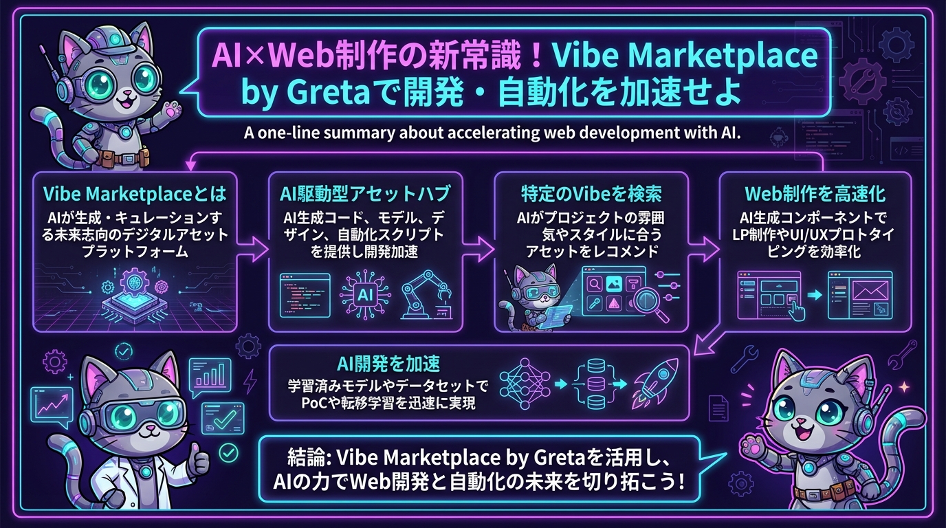 この記事では、Vibe Marketplace by GretaがWeb制作者やAI開発者にどのようなメリットをもたらし、どのように活用できるのかを深掘りしていきます。さあ、AIと共創する新しい開発体験の世界へ飛び込みましょう!