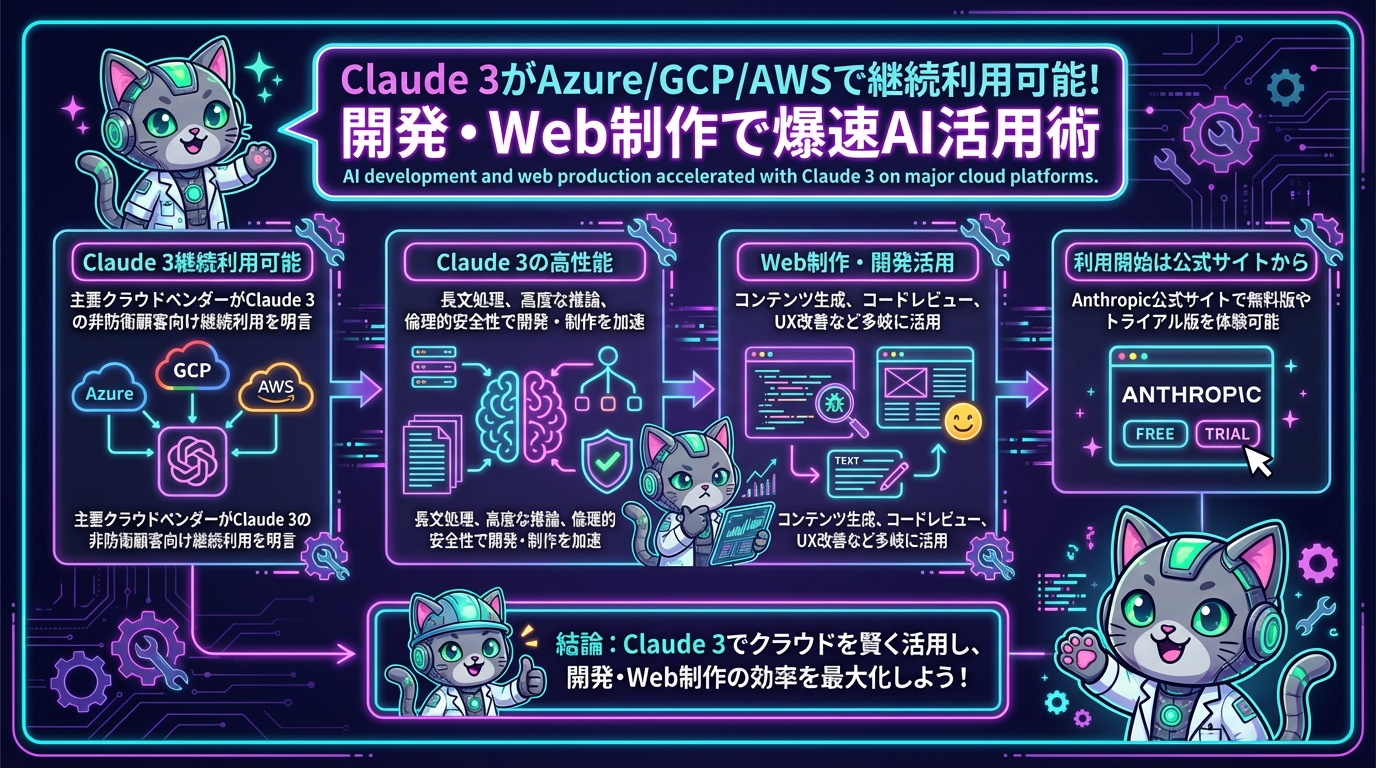 先日、一部でAnthropicのClaudeの利用継続性について懸念の声が上がっていたようですが、Microsoft、Google、Amazonの主要クラウドベンダー各社が「Anthropic Claudeは非防衛顧客向けに引き続き利用可能である」と明言しました。これは、私たち開発者やWeb制作者にとって、まさに朗報と言えるでしょう!